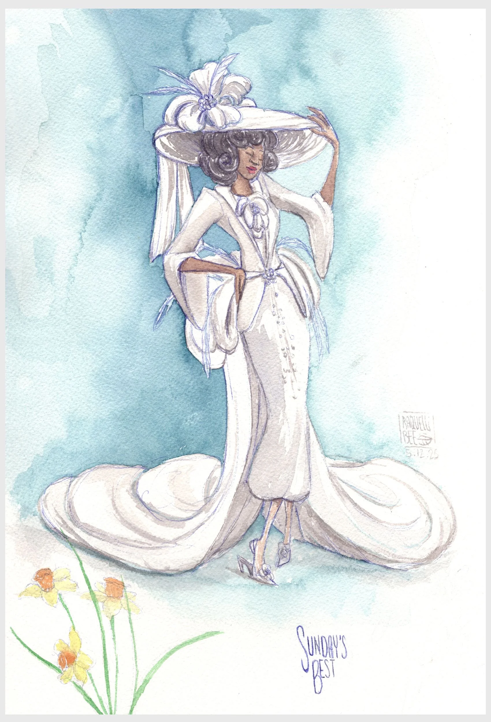 It starts with the oversized Sunday hat with an oversized bow. Then we need the suit, which is a crisp white paired with a soft blouse that sports the same motif as on the hat. Add the drama with a satin belt that has matching bow motifs trailing behind to make a grand train. Thus the silhouette of the suit is preserved but we have the drama fashion demands. Finished with fun accents of feathers and pearls.